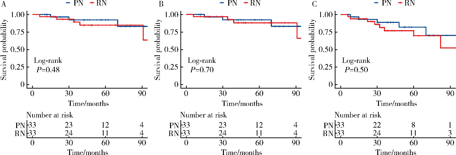 图1 匹配后队列中PN组和RN组的肿瘤学结局Figure 1 Oncological outcomes of PN group and RN group in the matched cohort A, overall survival; B, cancer-specific survival; C, disease-free survival of patients with pT3a stage renal cell carcinoma in the matched cohort. PN, partial nephrectomy; RN, radical nephrectomy; pT3a, pathological T3a. |