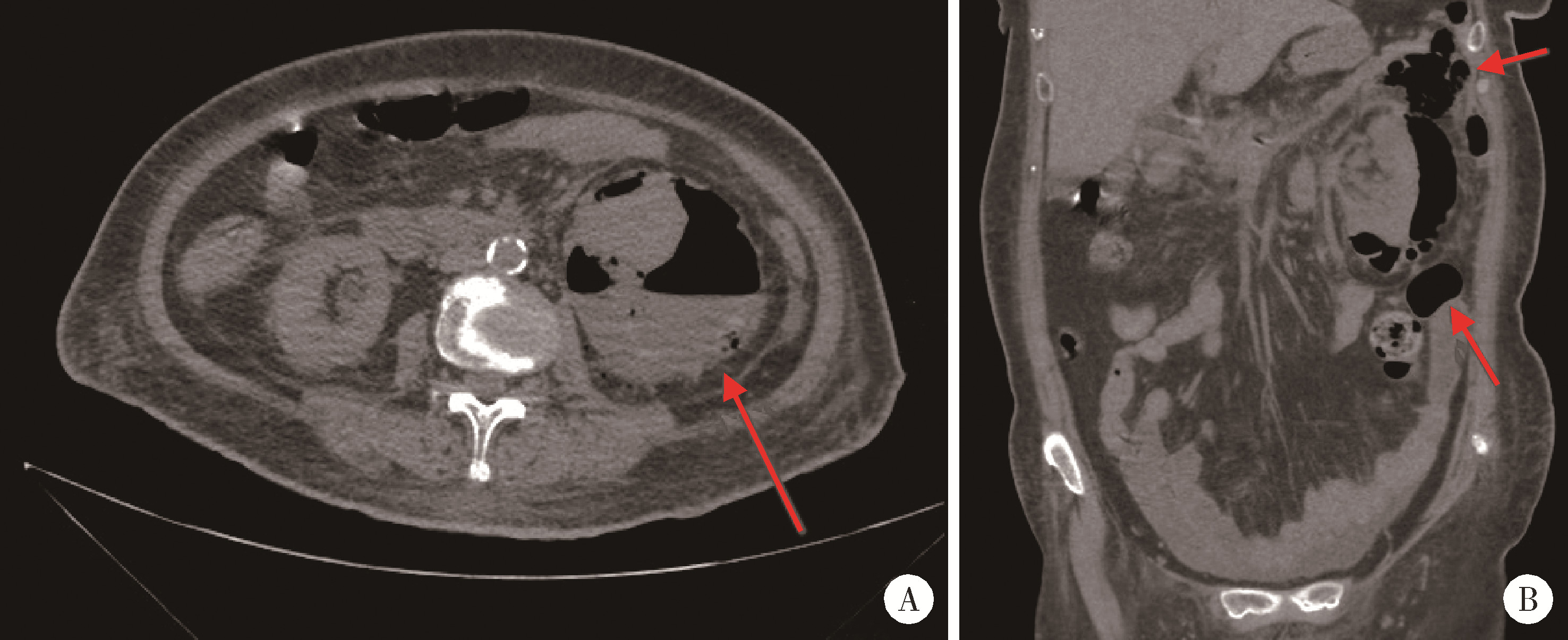 图1 1例左肾EPN患者的CT平扫结果,分级ⅢB级Figure 1 Non-contrast CT images of a patient with left renal EPN, classified as grade ⅢB A, axial CT image demonstrated extensive perirenal gas and fluid accumulation with an air-fluid level (red arrow); B, coronal CT image revealed signi-ficant retroperitoneal gas (red arrow). EPN, emphysematous pyelonephritis. |