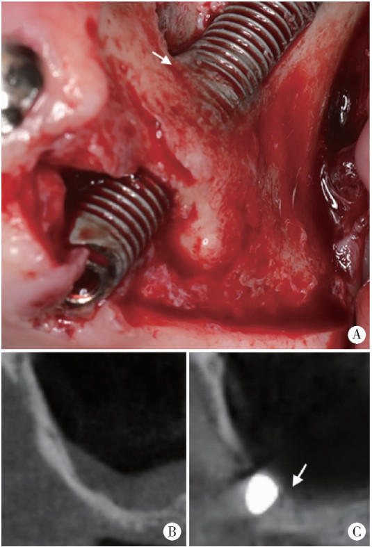 图6 1例颧周感染患者手术探查时发现上颌窦底成骨Figure 6 Osteogenesis of the maxillary sinus floor during surgical exploration in a patient with peri-zygomatic infection A, surgical exploration, arrow indicating new bone formation; B, pre-operative cone beam CT (CBCT); C, CBCT at 12 months after surgery, arrow indicating new bone formation. |
