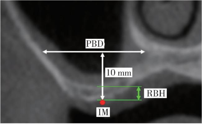 图2 RBH和PBD的测量Figure 2 Measurement of RBH and PBD IM, implantation point of zygomatic implant; PBD, distance between the palatal and buccal wall; RBH, residual bone height. |