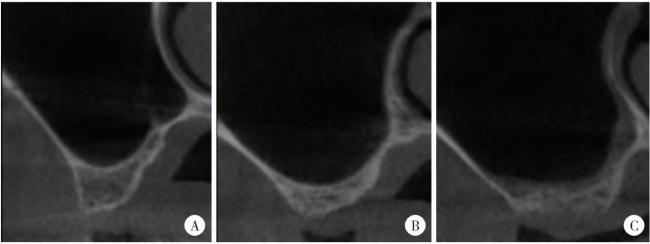 图3 上颌窦颊腭向轮廓Figure 3 Morphology of maxillary sinus in the buccal and palatal directions A, taper; B, round; C, flat. |