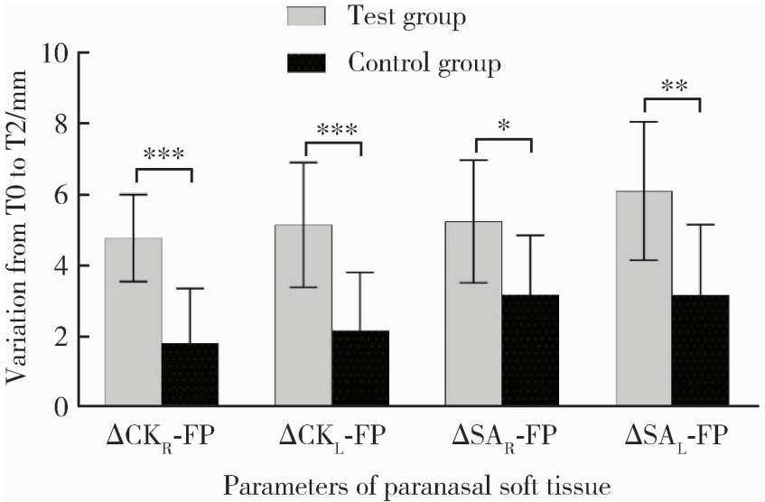 表3 T2期试验组和对照组的三维头影测量值对比Table 3 3D cephalometric values at T2 of test group and control group |