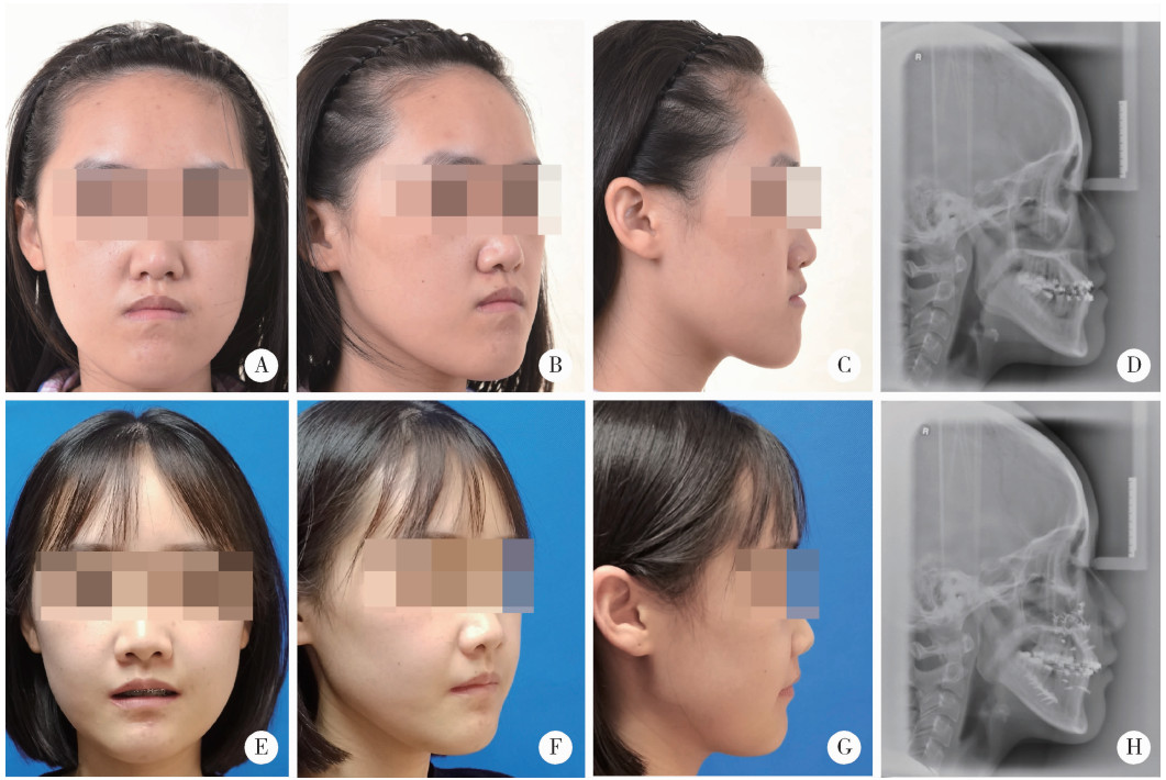 图5 对照组患者术前(T0)和术后6个月(T2)对比Figure 5 Photographs and X-ray of a patient in control group before (T0) and 6 months after surgery (T2) A-D, frontal photograph, 45° right side photograph, right lateral photograph and cephalometric lateral radiographs of T0; E-H, frontal photograph, 45° right side photograph, right lateral photograph and cephalometric lateral radiographs of T2. |