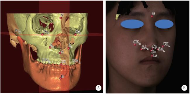 图1 三维头影测量标志点示意图Figure 1 Diagram of main landmarks in three-dimensional cephalometry A, landmarks of hard tissue; B, landmarks of soft tissue. The full names and explanations of all landmarks were listed in Table 1. |