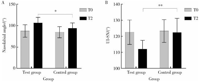 图2 T0期到T2期两组鼻唇角和上前牙唇倾角度的变化Figure 2 Nasolabial angle and UI-SN of T0 and T2 in test group and control group A, variations of nasolabial angle from T0 to T2 of test group and control group; B, variations of UI-SN from T0 to T2 of test group and control group. Student-t test, * P<0.05,* * P<0.01. UI-SN, angle of the axis of the right upper incisor and SN line. |