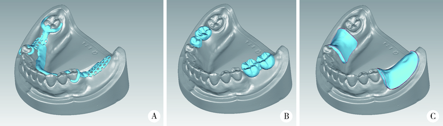 | Figure 2 Computer-aided designing of different assemblies A, framework; B, artificial teeth; C, denture base. |
