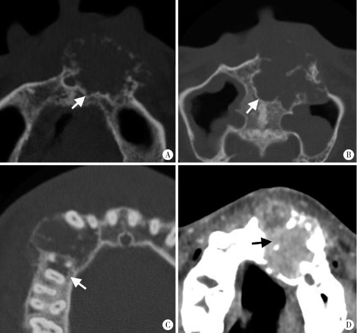 促结缔组织增生型成釉细胞瘤(desmoplastic ameloblastoma,DA)是一种特殊类型的成釉细胞瘤,其主要病理特征是肿瘤间质中结缔组织大量增生,肿瘤性上皮岛或条索边缘细胞呈扁平状紧密排列,可见化生性骨形成[1]。最早由Eversole于1984年报道[2],1992年和2005年WHO牙源性肿瘤分类中将其归类为成釉细胞瘤的一种亚型[3,4]。DA的发病率较低(8.65%)[5],多位于前牙区[6],与常见实性多囊型成釉细胞瘤(solid/multicystic ameloblastoma,SA)和单囊型成釉细胞瘤(unicystic ameloblastoma,UA)相比,存在一些临床、影像和病理学的独特性[7]。既往文献中针对性大样本的研究报道较少[6,8],本研究拟通过回顾性分析DA与其他类型成釉细胞瘤的临床和影像区别,进一步探讨DA的CT影像学特点。