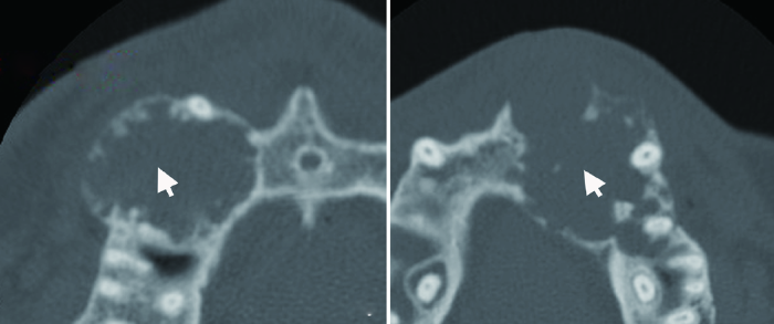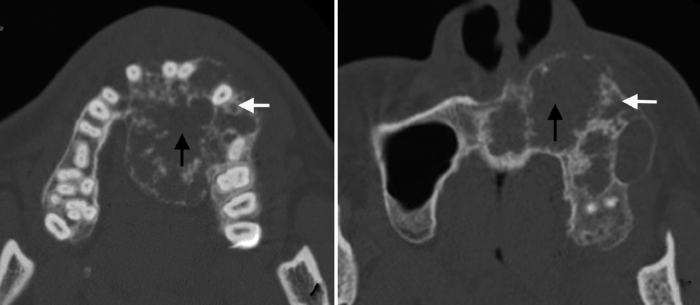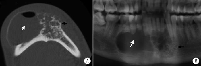 Axial CT image (A) and cropped panoramic tomography (B) shows the lesion is composed of the unicystic part (white arrows) and ossification part of DA (black arrows).