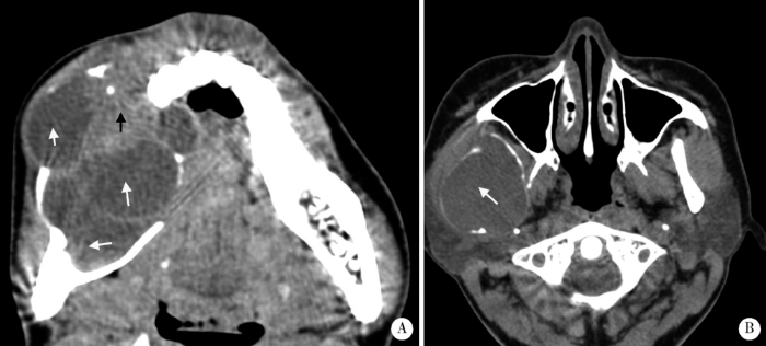 调阅相关病例DICOM格式CT资料,由两名影像科医生于监视器中使用多平面重组软件共同读片,分别于软组织窗及骨窗观察。提取影像学关键特征进行分析:边界、周围骨质变化、外形、内部结构、囊实性、牙移位、牙根吸收、牙周膜情况、密质骨连续性或骨膜反应。测量长轴径、颊舌径、高度评价肿物的颊舌向膨隆程度,沿病变区牙列或颌骨走形方向测量长轴径,沿肿物的颊舌向测量颊舌径,肿物冠状位方向的最大径定义为高度。在病变内部测量圆形感兴趣区(region of interest,ROI),测量平均CT值。