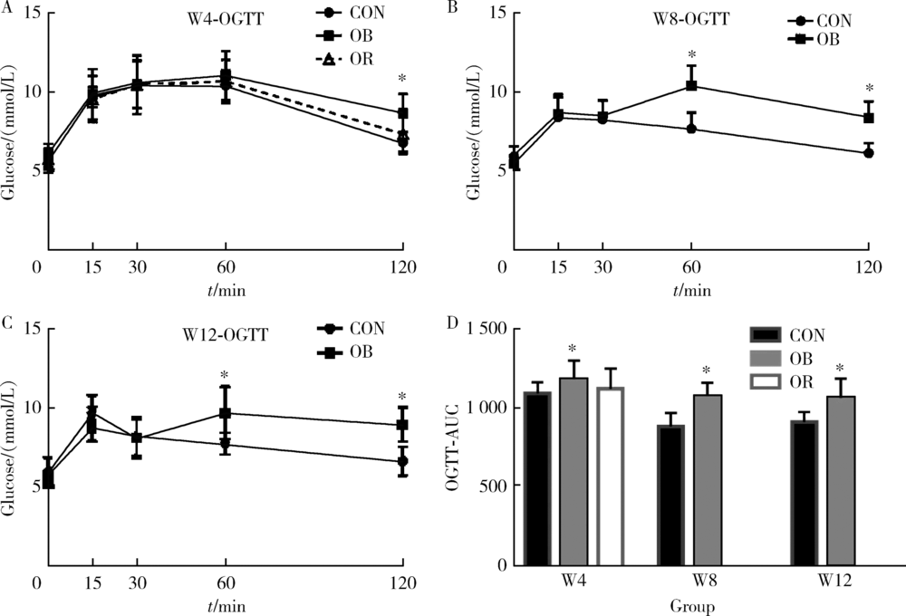 | Figure 2 OGTT of rats with high-fat diet feeding *P<0.05, OB compared with CON. CON, control; OB, obesity; OR, obesity resistance; OGTT, oral glucose tolerance test; AUC, area under the curve; W4, week 4; W8, week 8; W12, week 12. |