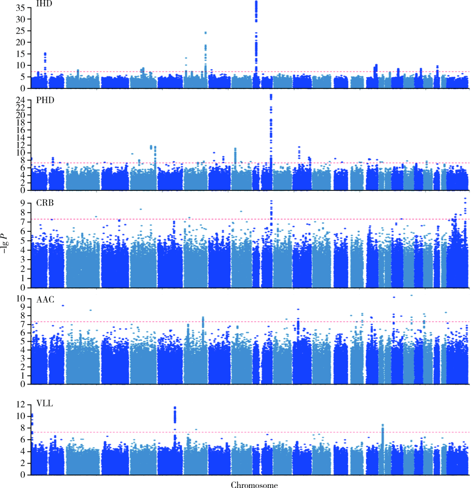 | Figure 1 Manhattan plots of five CVD subtypes IHD, ischaemic heart diseases; PHD, pulmonary heart disease and diseases of pulmonary circulation; CRB, cerebrovascular diseases; AAC, diseases of arteries, arterioles and capillaries; VLL, diseases of veins, lymphatic vessels and lymph nodes, not elsewhere classified. |