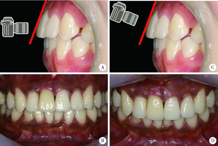 A, the shooting angle is not perpendicular to the tooth surface; B, the photo cannot reflect the actual width-to-length ratio of the crown and the incisal edge curvature; C, the shooting angle is perpendicular to the tooth surface; D, the photo can reflect the actual width-to-length ratio of the crown and the incisal edge curvature.