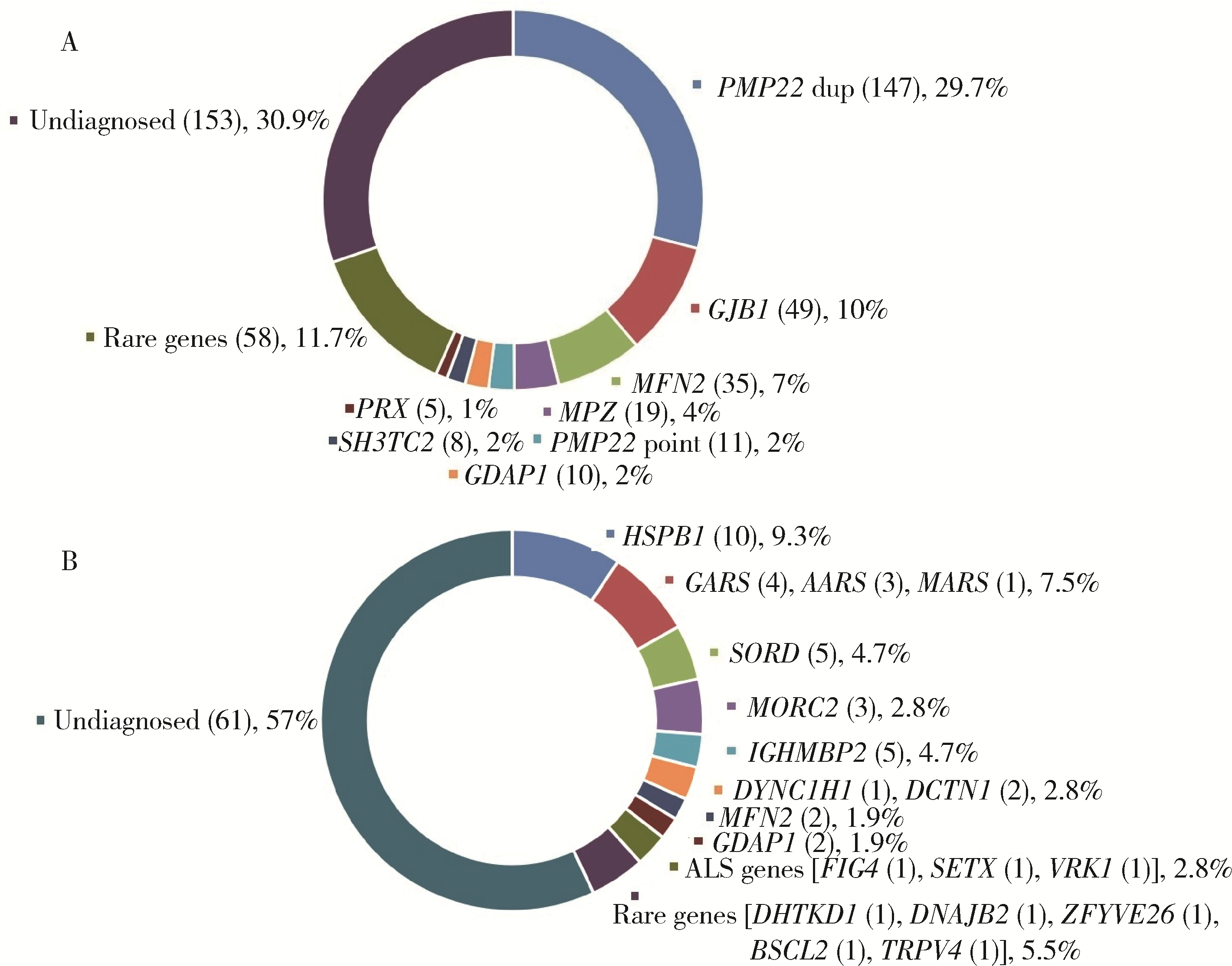 | Figure 3 Genetic distribution of CMT (A) and HMN (B) The number of examples is in the bracket, followed by the percentage. CMT, Charcot-Marie-Tooth; HMN, hereditary motor neuropathy. |