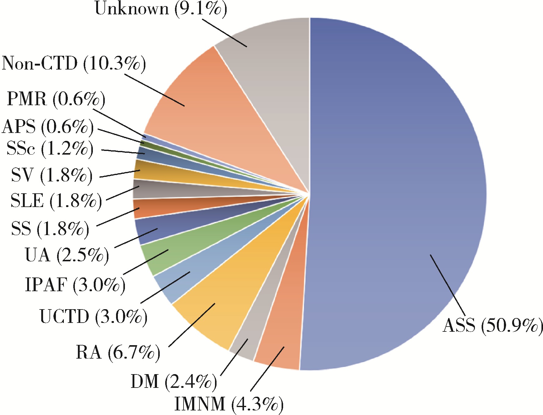 | Figure 1 Disease distribution in patients with positive anti-Jo-1 antibody ASS, anti-synthetase syndrome; IMNM, immune-mediated necrotizing myositis; DM, dermatomyositis; RA, rheumatoid arthritis; UCTD, undifferentiated connective tissue disease; IPAF, interstitial pneumonia with autoimmune features; UA, undifferentiated arthritis; SS, Sjögren's syndrome; SLE, systemic lupus erythematosus; SV, systemic vasculitis; SSc, systemic sclerosis; APS, antiphospholipid syndrome; PMR, polymyalgia rheumatica; Non-CTD, non-connective tissue disease. |